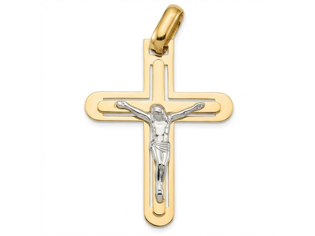 Zlatý křížek v kombinaci žlutého a bílého zlata ryzosti 585/1000. Rozměr přívěsku je 32x24mm, celková délka 38mm, šířka ramene 5mm, hmotnost 1.85g.