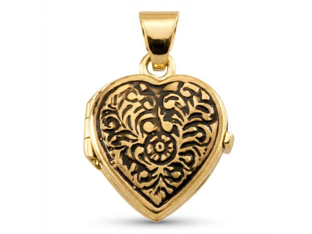 Zlatý otevírací medailonek srdce ve žlutém 14ti karátovém zlatě ryzosti 585/1000. Rozměr přívěsku je 16x15mm, celková délka 2.5cm, váha 3.10g. Medailonek je zdobený černým rhodiem. Přívěsek je otevírací, připravený na vložení 2ks fotografií.