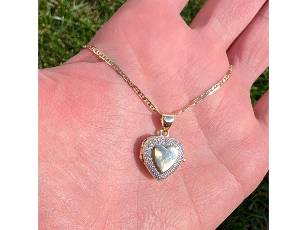 Zlatý otevírací medailonek ve tvaru srdce se zirkony