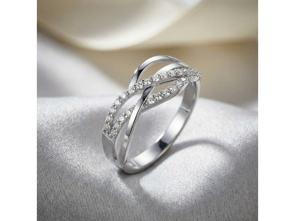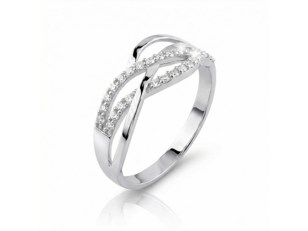 Zlatý dámský moderní prsten s bílými zirkony v bílém zlatě.