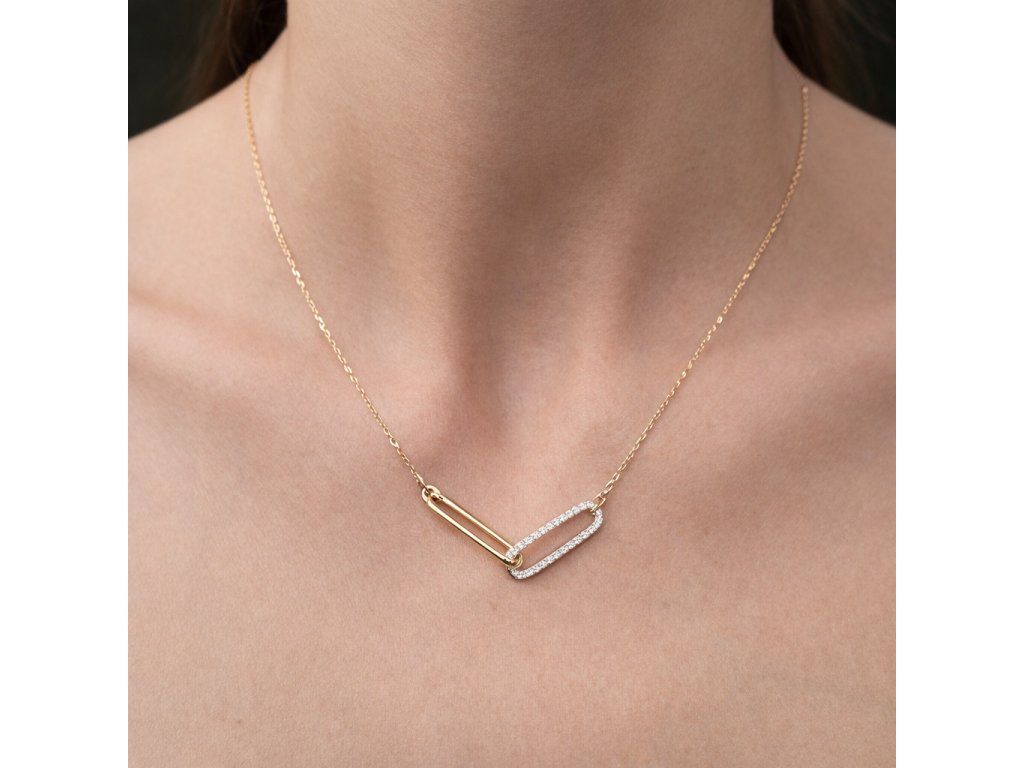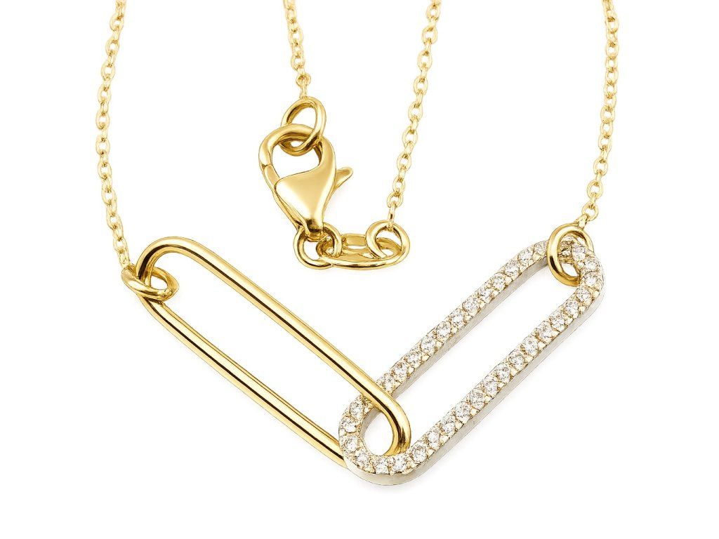 Zlatý dámský náhrdelník se dvěma oválnými články v kombinaci žlutého a bílého 14ti karátového zlata ryzosti 585/1000 o nastavitelné délce 42+3cm na karabinový zápon. Rozměr oválku je 22x6.5mm, řetízek typu anker o šíři 1.2mm, váha 3.00g.
