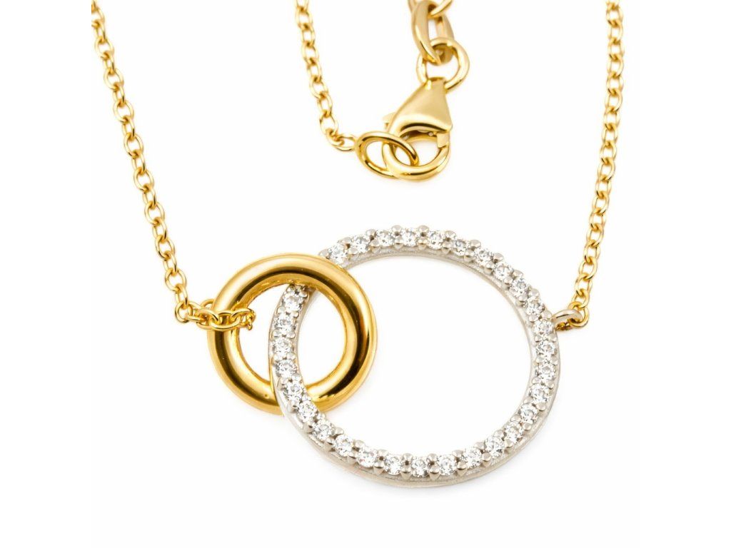 Zlatý dámský náhrdelník s propletenými kroužky v kombinaci žlutého a bílého 14ti karátového zlata ryzosti 585/1000 o délce 42cm na karabinový zápon. Rozměr kroužku je 16 a 9mm, váha 3.32g, šíře řetízku 1.2mm (anker). Kruhová ozdoba je zdobena čirými zirkony.