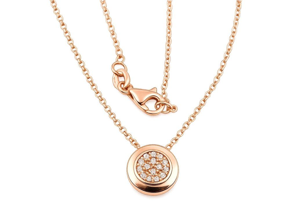Zlatý náhrdelník s ozdobou se zirkony v růžovém 14ti karátovém zlatě ryzosti 585/1000 o délce 42cm na karabinový zápon. Průměr ozdoby je 10mm, řetízek typu anker o šíři 1.2mm, váha 2.75g.