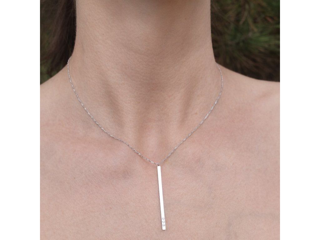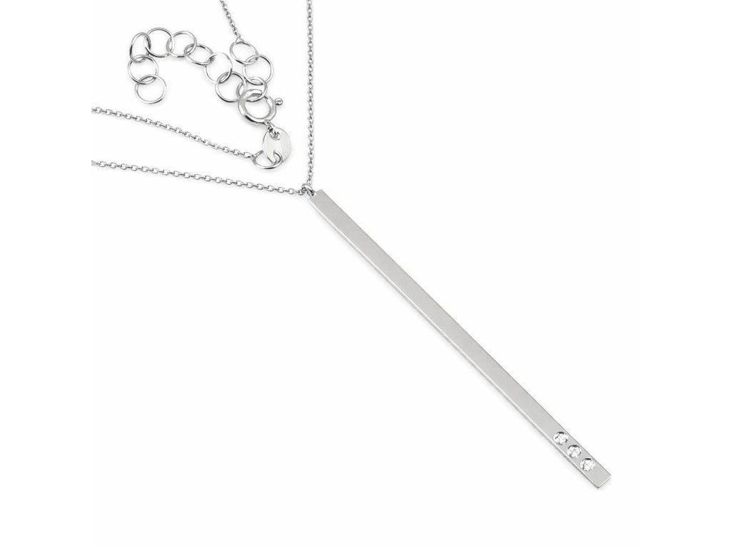 Zlatý elegantní náhrdelník v bílém 14ti karátovém zlatě ryzosti 585/1000 o nastavitelné délce 42+3cm na zápon SK kroužek. Rozměr ozdoby je 45x2.2mm (zdobena 3 čirými zirkony), řetízek typu anker o šířce 0.6mm, celková hmotnost 2.05g.