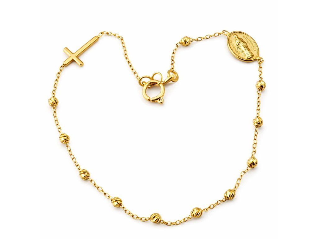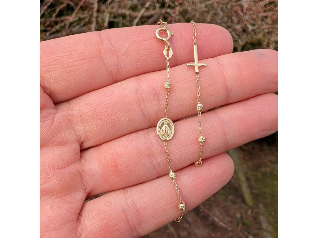 Zlatý náramek s křížkem a madonkou ve žlutém 14ti karátovém zlatě ryzosti 585/1000 na zápon SK kroužek o nastavitelné délce 18+1cm.