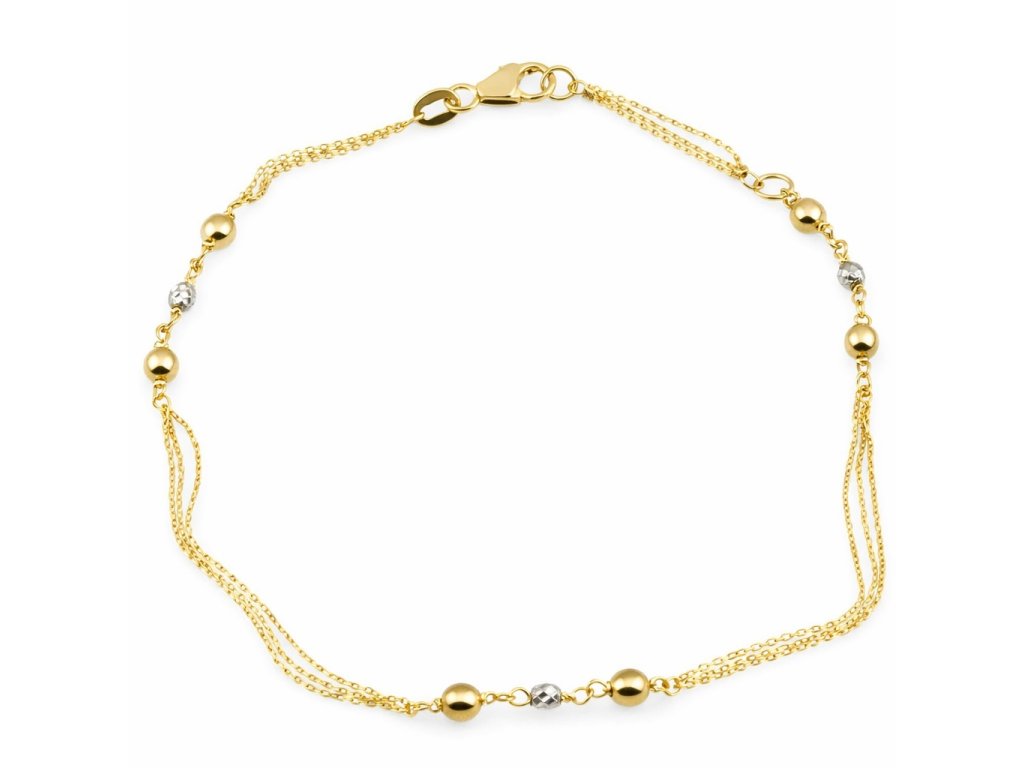 Zlatý náramek s kuličkami v kombinaci žlutého a bílého 14ti karátového zlata ryzosti 585/1000 o nastavitelné délce 17+2cm. Průměr kuličky je 3mm, váha 1.55g, dvojitý řetízek typu anker o šíři 0.7mm, karabinový zápon.