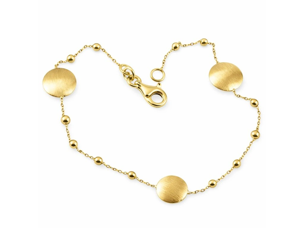 Zlatý náramek s kuličkami a ozdobami ve tvaru penízků ve žlutém 14ti karátovém zlatě ryzosti 585/1000 o délce 19cm. Průměr penízku je 8mm, průměr kuličky 2.3mm, šíře řetízku 0.80mm, váha 3.0g, karabinový zápon.