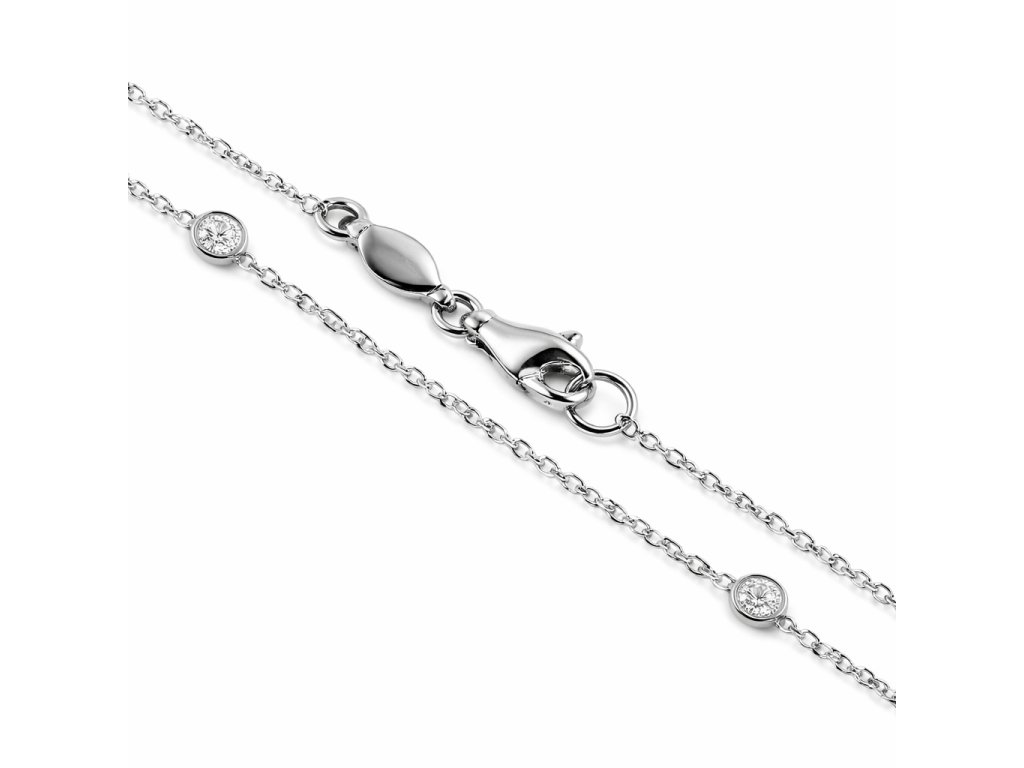 Zlatý náramek s čirými zirkony v bílém 14ti karátovém zlatě ryzosti 585/1000 o nastavitelné délce 17 a 19cm na karabinový zápon. Průměr kamínkové ozdoby je 3mm, šíře řetízku 1.2mm, váha 1.30g.