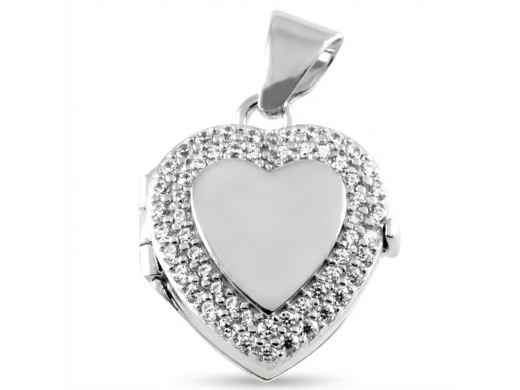 Zlatý otevírací medailonek srdce v bílém 14ti karátovém zlatě ryzosti 585/1000 o rozměru 16x15mm, celková délka 25mm. Celková hmotnost je 4.70g. Medailonek je zdoben čirými zirkony.