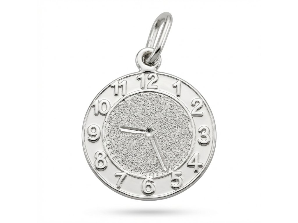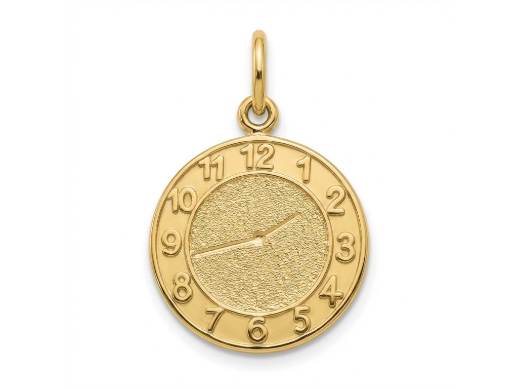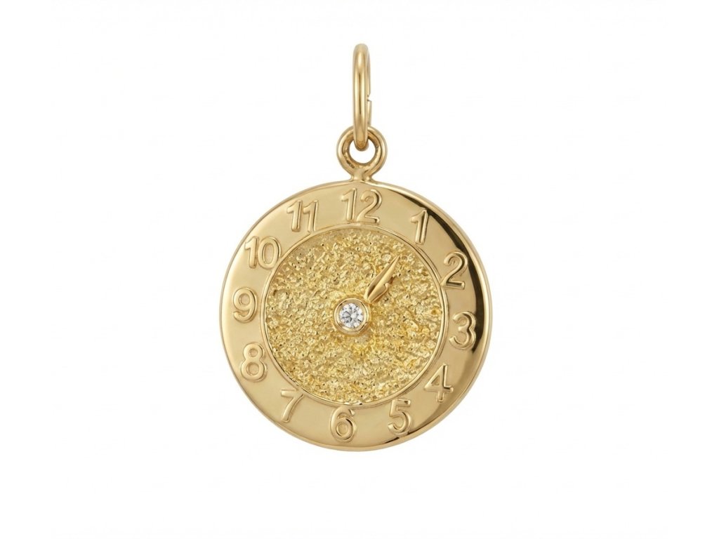 Zlatý přívěs ve tvaru hodin ve 14ti karátovém zlatě o hmotnosti +/- 1.25g a průměru 1.4cm. Přívěs je v kombinované povrchové úpravě lesk a mat. V ceně přívěsu máte vyryté tyto údaje o Vašem narozeném děťátku: z přední strany hodinové ručičky ukazující přesnou hodinu a minutu narození, ze zadní strany jméno dítěte, datum narození, délku a váhu při nazorení např.: