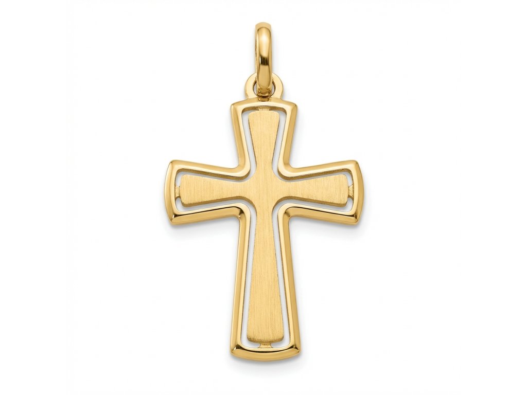 Zlatý přívěsek kříž ve žlutém 14ti karátovém zlatě ryzosti 585/1000 o rozměru 25x16mm, šíře ramena max 5.5mm, váha 1.00g, celková délka 33mm, kombinace lesk/mat.
