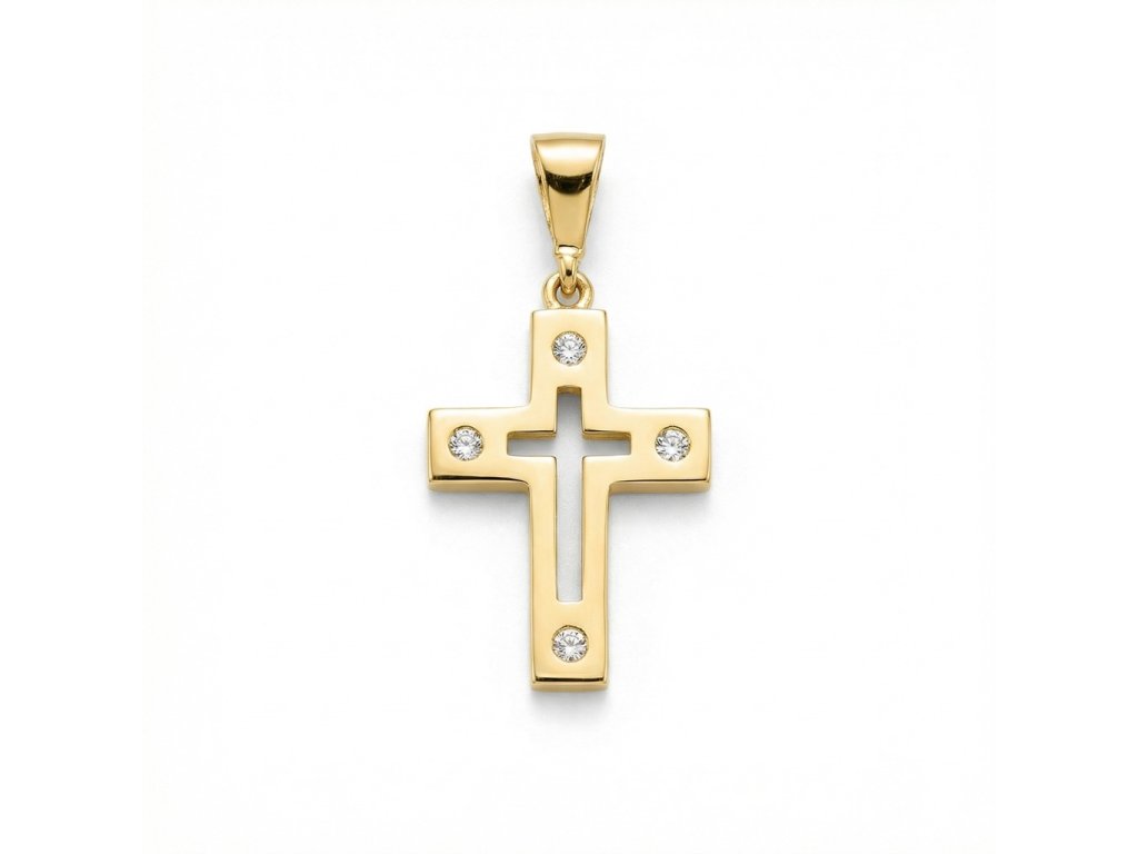 Zlatý přívěsek křížek zdobený čirými zirkony ve žlutém 14ti karátovém zlatě ryzosti 585/1000 o rozměru 17x11mm, šíře ramene 2.5mm, celková délka 23mm, váha 0.95g.