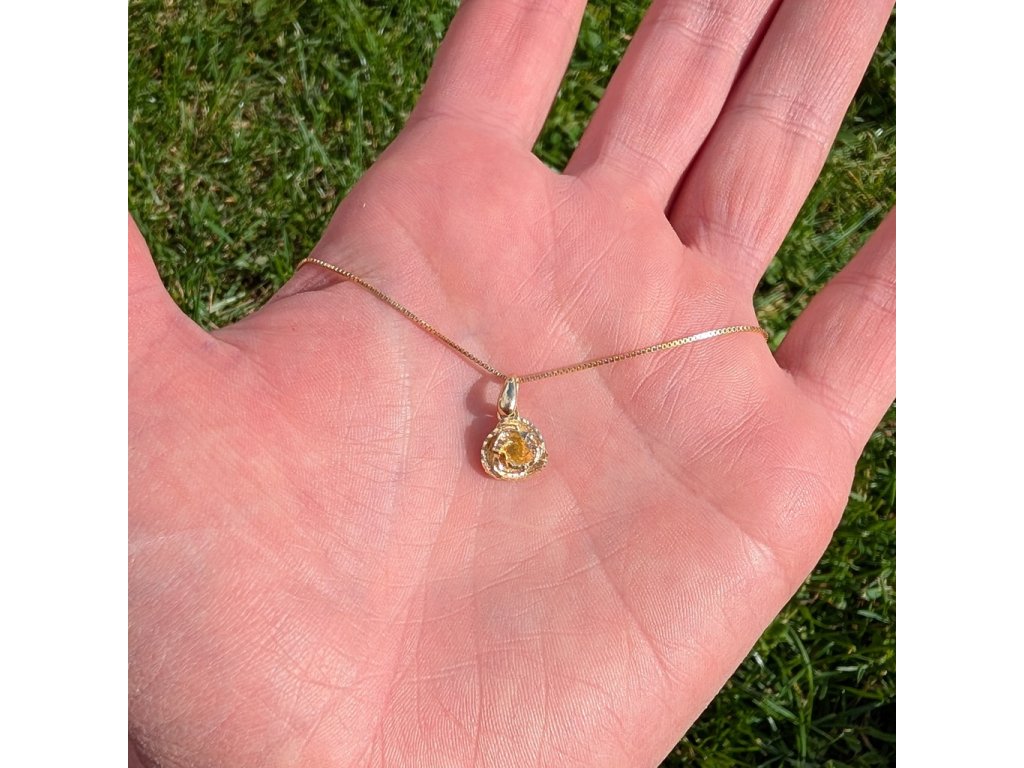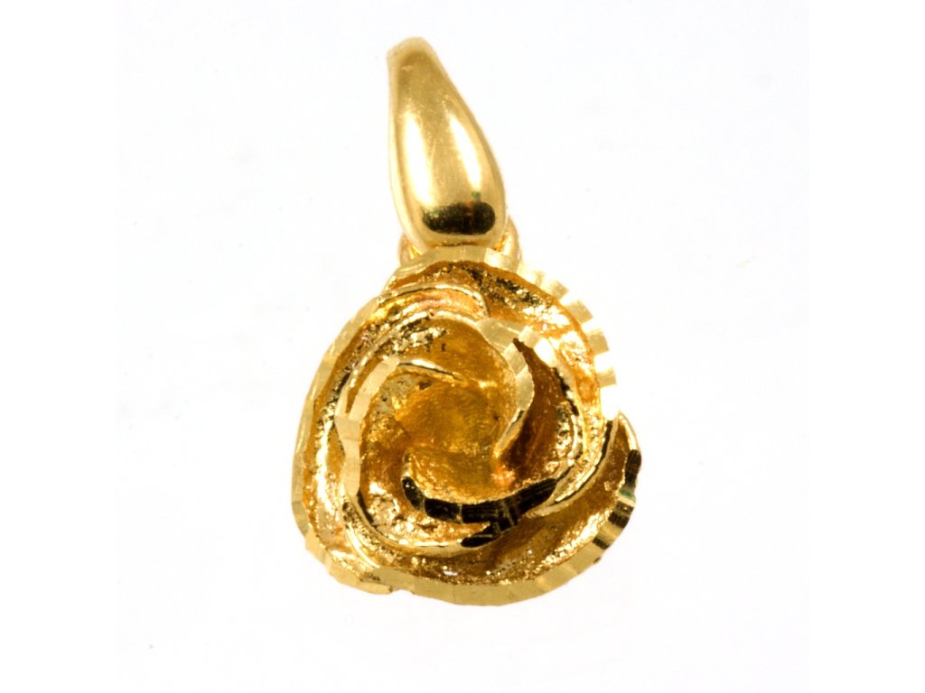 Zlatý přívěsek ve tvaru růže ve žlutém 14ti karátovém zlatě ryzosti 585/1000. Průměr ozdoby je 9mm, celková délka 15mm, váha 0.92g.