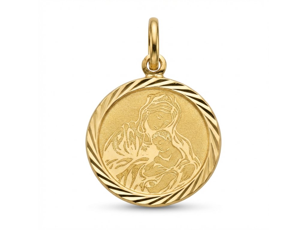 Zlatý přívěsek s madonou ve žlutém 14ti karátovém zlatě ryzosti 585/1000 o průměru 17mm, 0.87g, povrchová úprava lesk/mat.