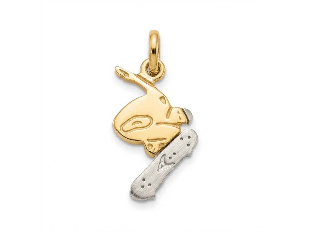 Zlatý přívěsek skatebardista v kombinaci žlutého a bílého zlata.