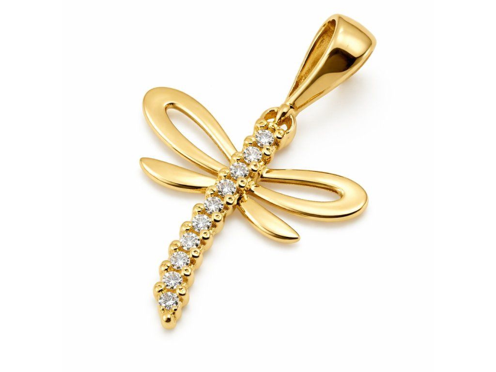 Zlatý přívěsek ve tvaru vážky ve žlutém 14ti karátovém zlatě ryzosti 585/1000 o rozměru 14x13mm, celková délka 2cm, váha 0.82g. Ozdoba je zdobena čirými zirkony.