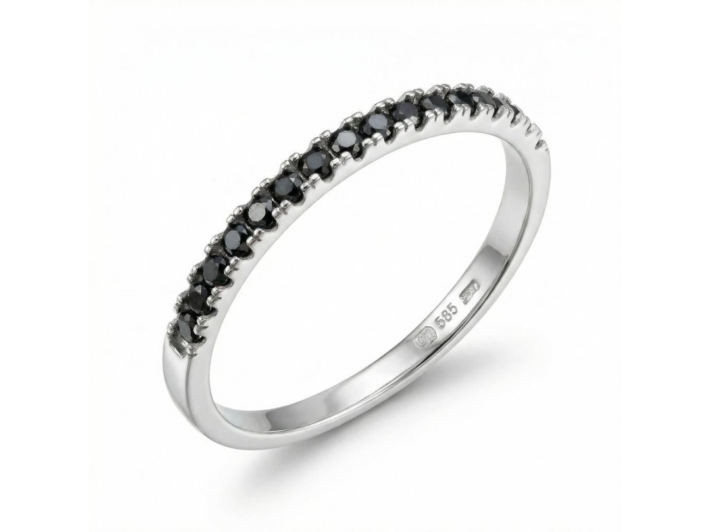 Zlatý dámský prsten – kroužek s černými barvenými zirkony v bílém 14ti karátovém zlatě ryzosti 585/1000. Šíře ozdoby prstenu je 2mm, šíře spodní části prstenu - šíny 1.8mm, váha +/- 1.35g.