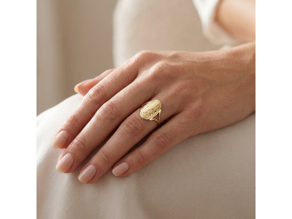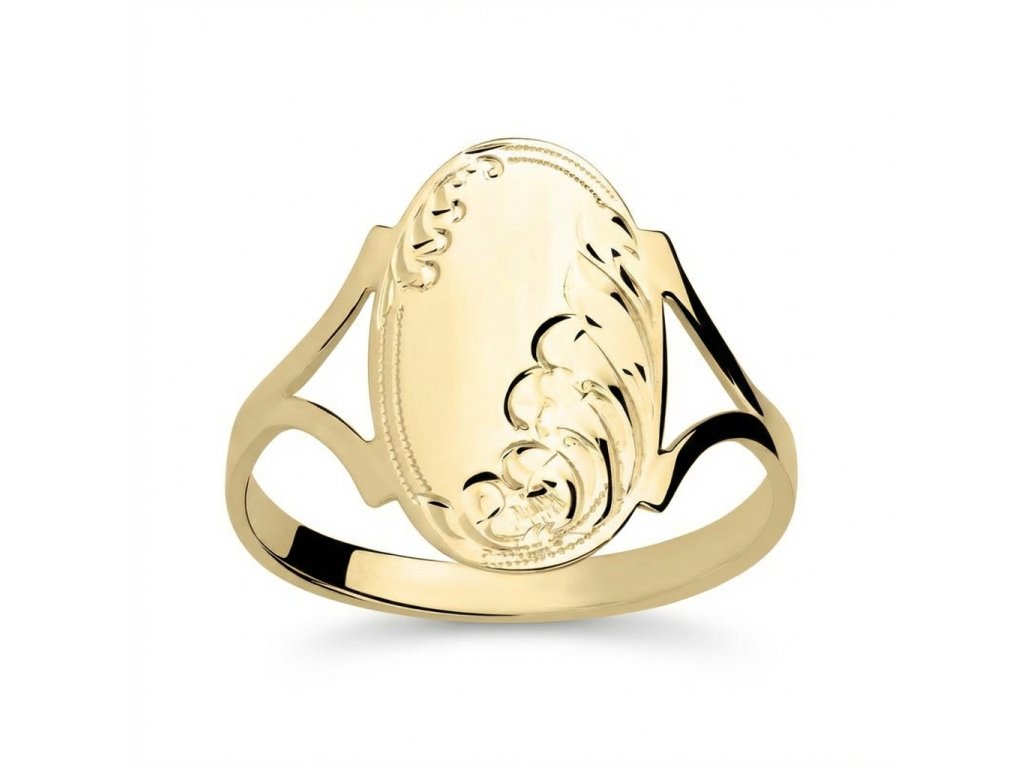 Zlatý dámský prsten s oválnou ozdobou ručně gravírovaný
