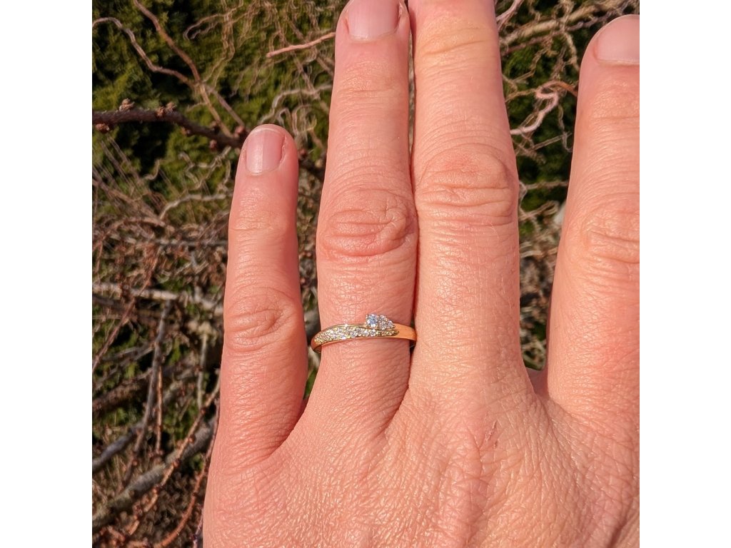 Zlatý dámský prsten zdobený čirými zirkony ve žlutém/růžovém 14ti karátovém zlatě ryzosti 585/1000. Šíře prstenu je 3mm, váha +/-1.20g.