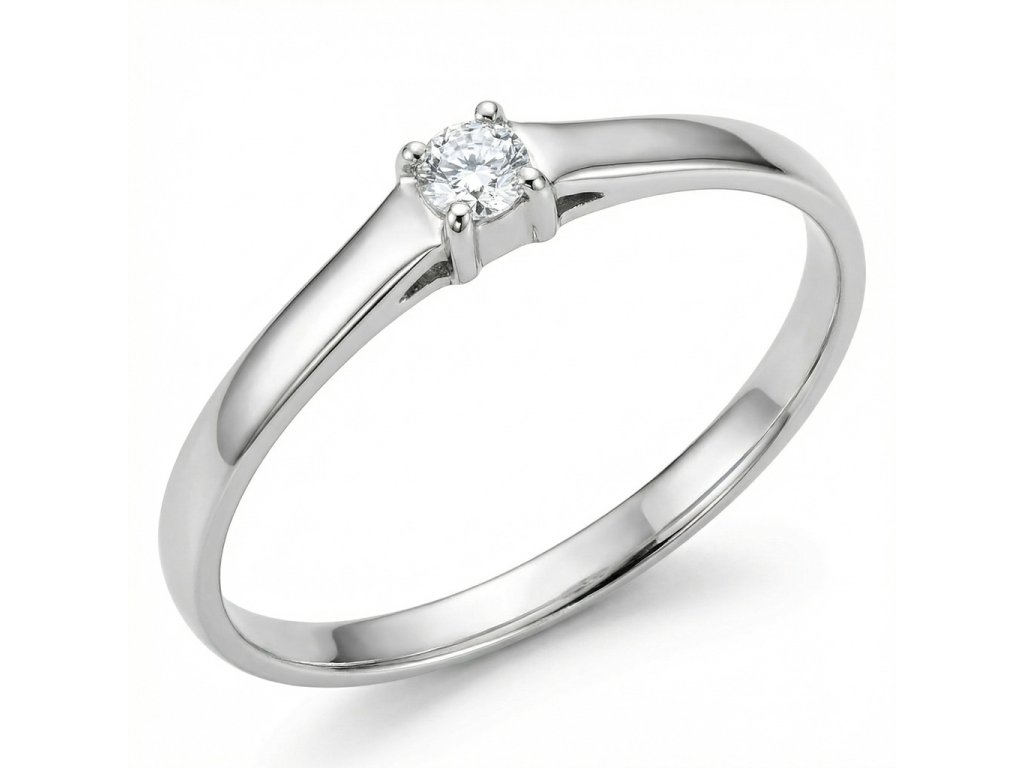 Zlatý prsten se zirkonem v bílém 14ti karátovém zlatě ryzosti 585/1000. Průměr kamene je 2.5mm, šířka prstenu ve spodní části 1.5mm a směrem vzhůru se rozšiřuje. Hmotnost prstenu je 1.25g/velikost 53.