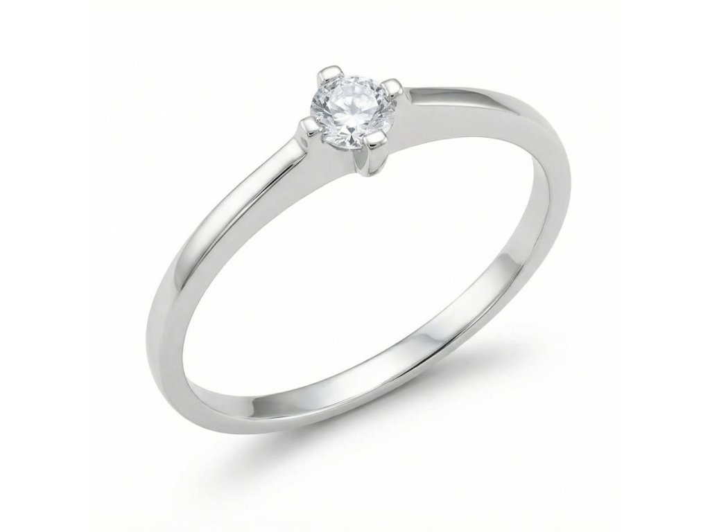 Zlatý zásnubní prsten se zirkonem v bílém/žlutém 14ti karátovém zlatě ryzosti 585/1000. Rozměr ozdoby je 5x5mm, průměr kamene 3.5mm, šířka spodní části prstenu – šíny 1.8mm, hmotnost +/- 1.60g(vel.53).