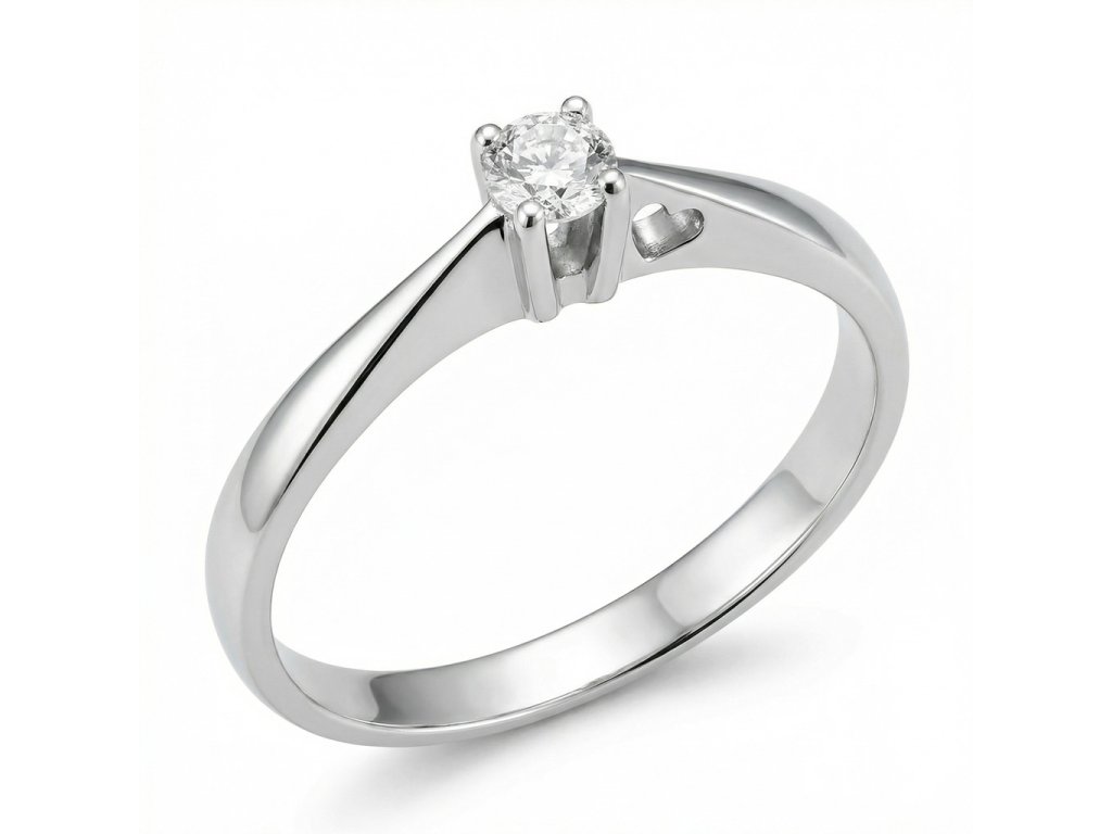 Zlatý prsten se zirkonem v bílém 14ti karátovém zlatě ryzosti 585/1000 ve velikosti 53. Průměr ozdoby je 3.5mm (zirkon průměr 3.1mm), šířka spodní části prstenu – šíny 2.30mm, váha 1,70g/vel.53. Prsten je bytelný, zdoben malým vyřezaným srdíčkem po boku prstenu.