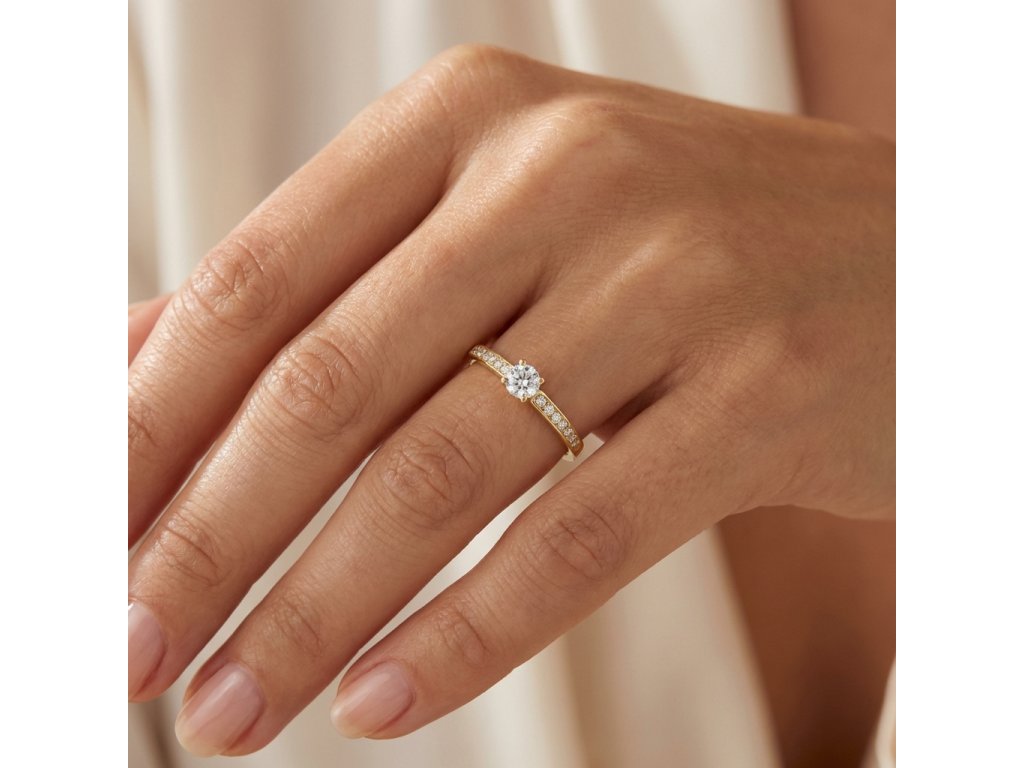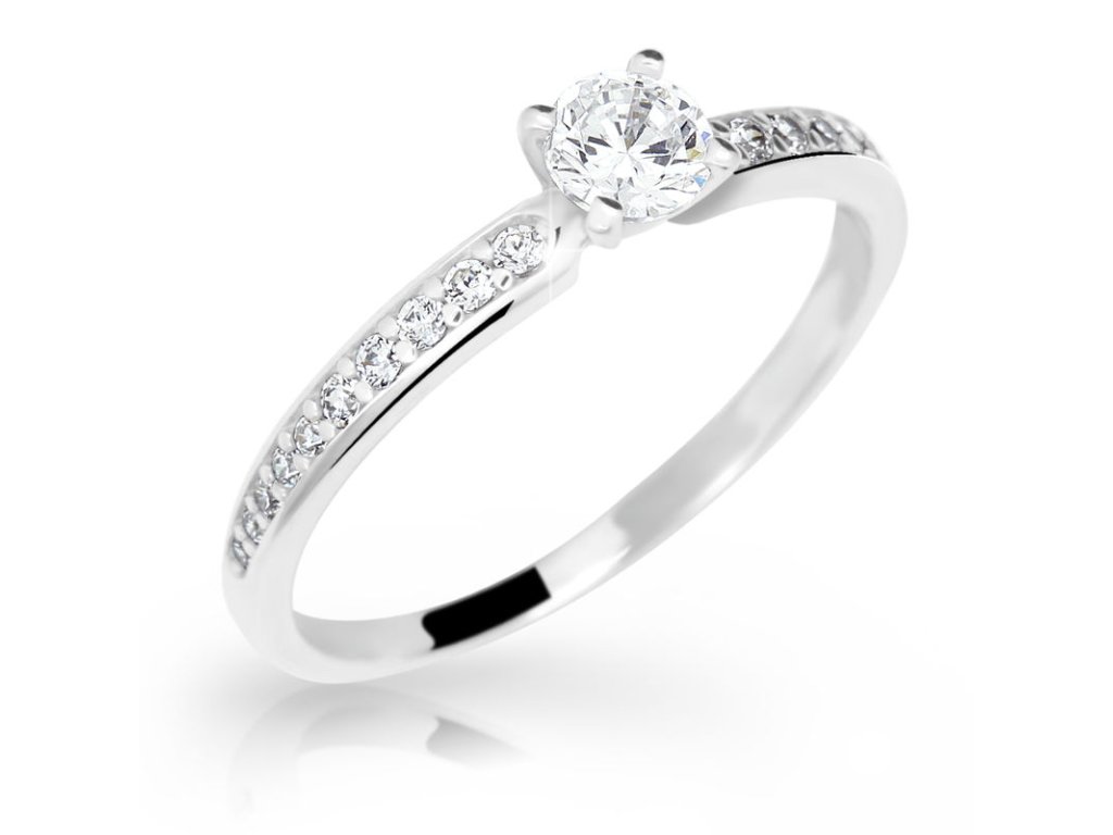 Zlatý prsten se zirkony ve žlutém/bílém 14ti karátovém zlatě ryzosti 585/1000. Průměr centrálního kamene je 3mm, šířka ozdoby i šířka spodní části prstenu je 2.5mm, hmotnost +/- 1.75g.