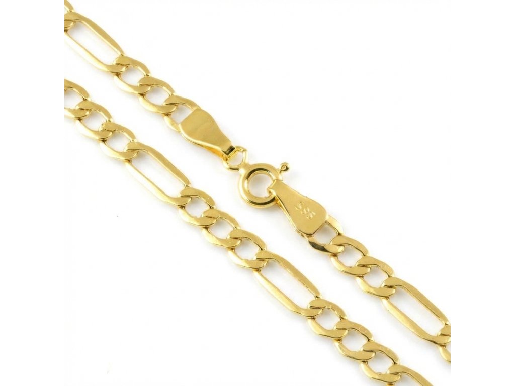 Zlatý pevný řetízek ve žlutém14ti karátovém zlatě typu figaro o délce 60 cm na zápon SK kroužek. Šíře řetízku je 4mm, váha 5.00g.