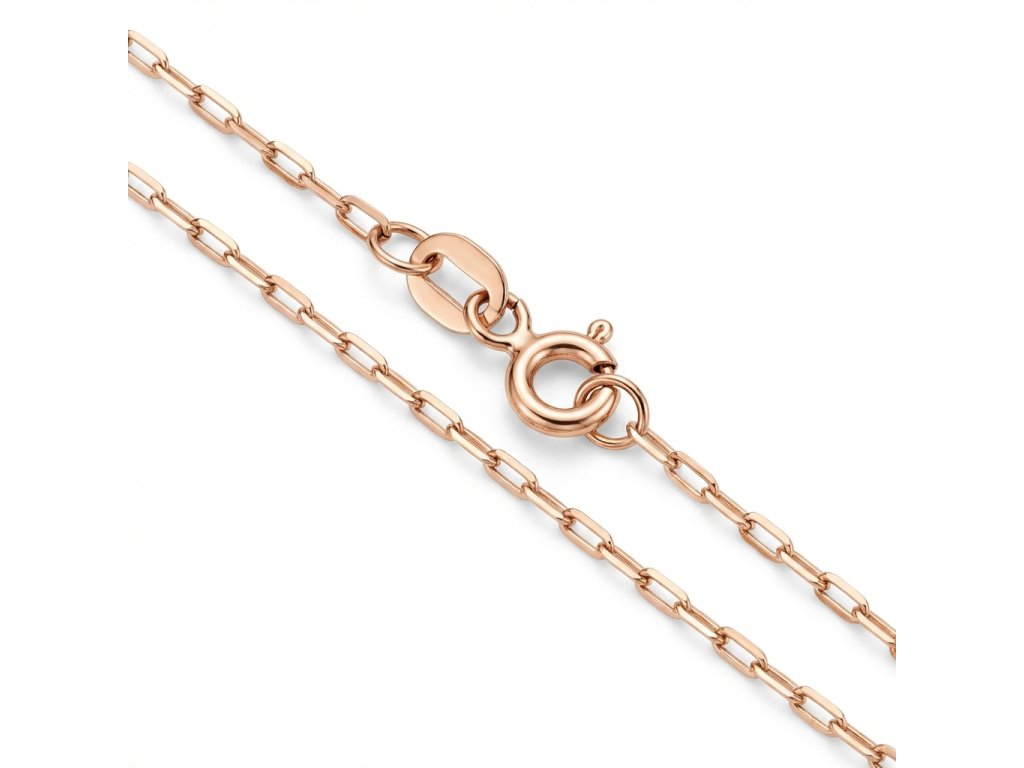 Zlatý pevný řetízek typu anker v růžovém 14ti karátovém zlatě ryzosti 585/1000 o délce 42 a 45cm na zápon SK kroužek. Šíře řetízku je 1.4mm.