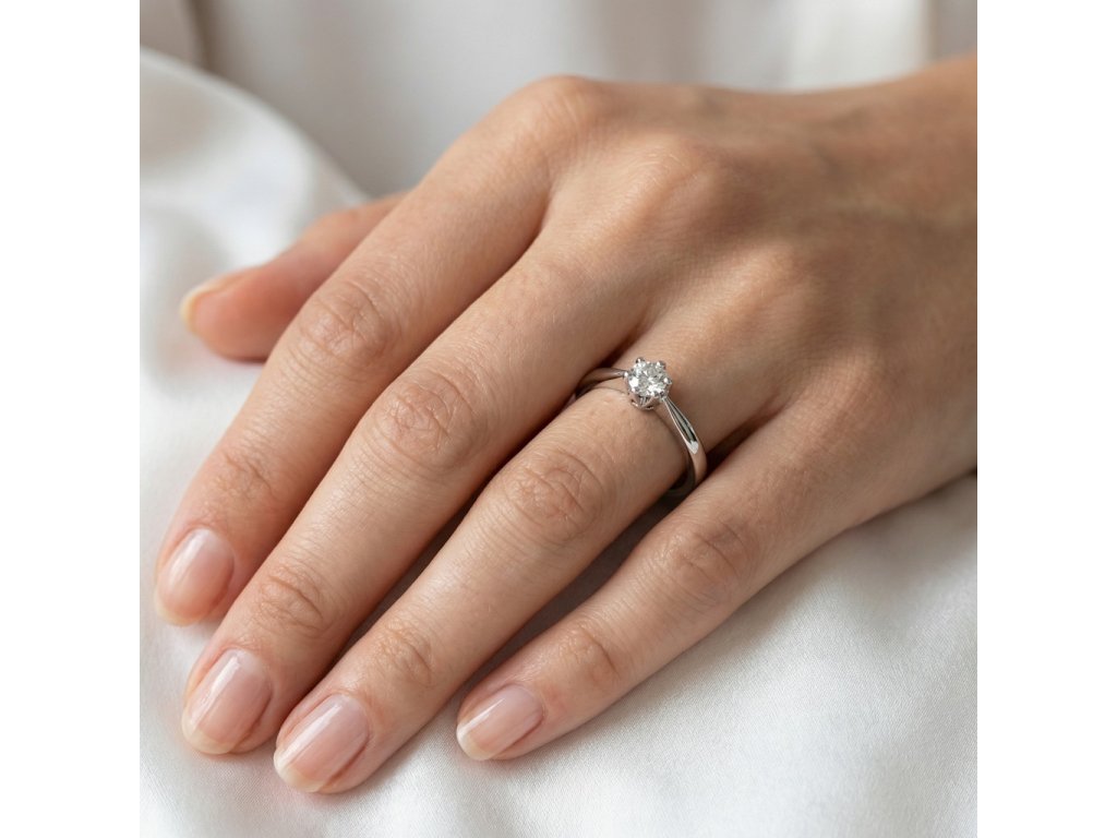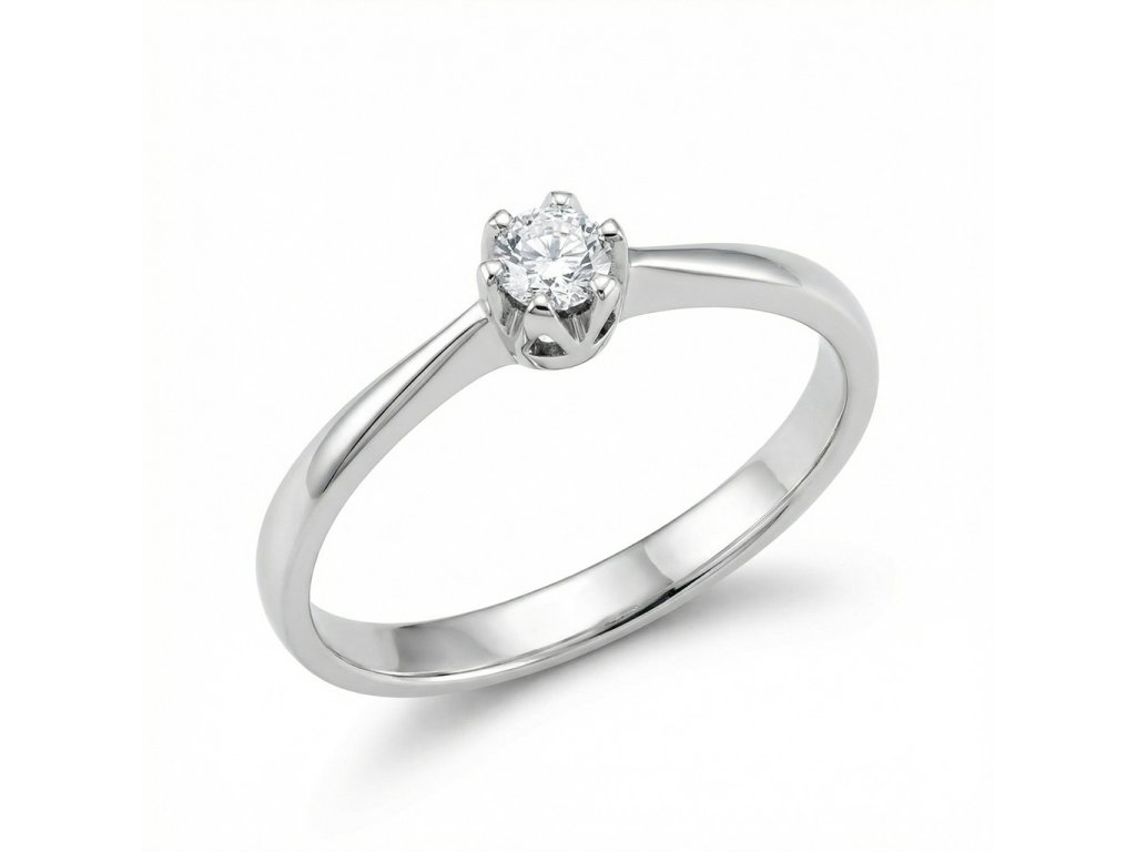 Zlatý zásnubní prsten s čirým zirkonem o průměru 3.2mm v bílém 14ti karátovém zlatě ryzosti 585/1000 ve velikosti 54. Průměr ozdoby je 4 mm, šířka spodní části prstenu – šíny 2.5mm, hmotnost +/- 1.90g.